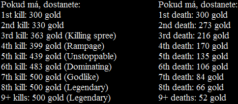 - Zisk: Hra generuje každému hráči 7 gold per 5 s (od 1:30 min). Za zabíjení minionů (zisk za zabití se časem zvyšuje) a neutrálních monster (cena je pevná, viz předminulý článek). Za zabití epických monster dostáváte globálně goldy. Za zabití petů a ward. Za zabití hrdiny dostanete základ 300 goldu (ceny se pak mění, dle nepřátelských zabití či smrtí, viz tabulka) a 70% z goldů se rozdělá poměrně dle damage mezi assistery. First Blood je oceněný 100 goldy navíc. Za zničení věže dostane tým 150 goldů. Za zničení Nexusu dostane tým 50 goldů. Dále tu jsou schopnosti hrdinů, které zvyšují zisk či vylepšený smite. Zvýšení generování goldu lze provést předměty z obchodu, koupí run nebo masteries či Twisted Fatovi pasivky. Předměty se prodávájí za 70% své ceny, na generování goldů jen za 50%.