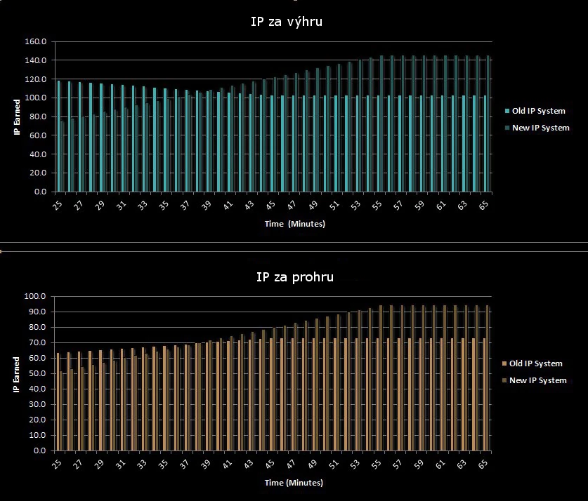 - Zisk: Čím déle hrajete, tím více jich dostanete. Ranked a Normal: Od 55 minuty se zisk nezvyšuje. Za výhru dostanete 18,2 + 2,3/min IP. Za prohru dostanete 15,4 + 1,4/min IP. First win of the day vám dá 150 IP ve všech typech her a není ničím snižován, znovu jej lze dostat až za 22 h. IP Boost zvyšuje zisk na 200% IP (nezvyšuje First win of the day). Custom game a Coop vs. AI sdílějí časové omezení, kdy po 150 min už nezískáte žádné IP, restartování je až po 22 h. Pokud se vzdáte, dostane méně IP. Za Custom game je snížení zisku o 25%.