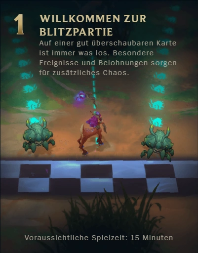 Ein Spiel Blitzpartie dauert normalerweise 15 Mifnuten, wobei das letzte Event bei 18 Minuten dafür sorgt, dass das Spiel kurz darauf beendet wird.