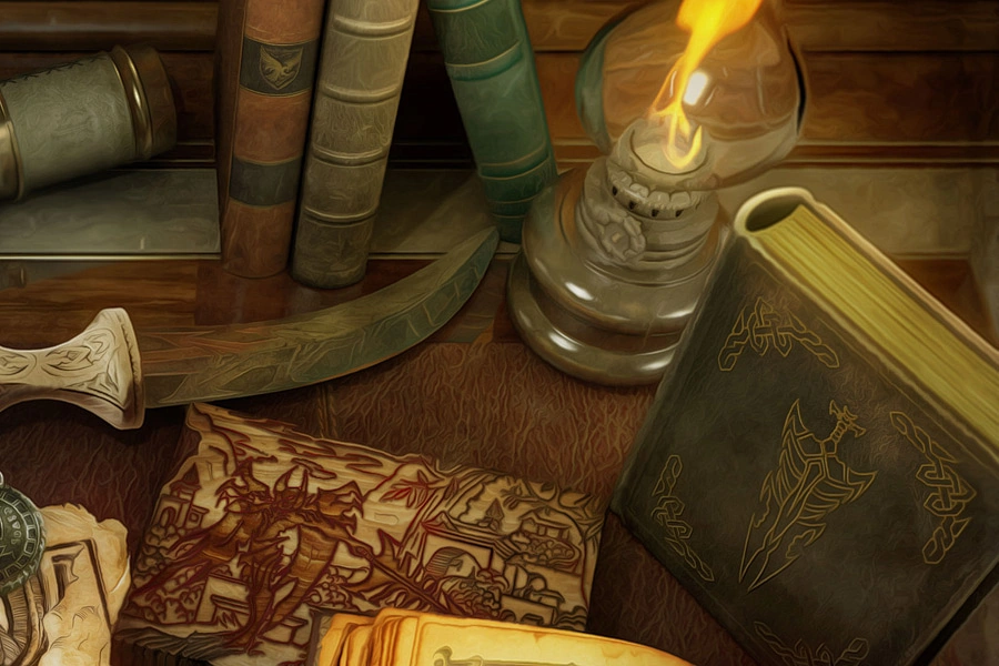 Als mir die Ähnlichkeiten zwischen dem demacianischen Buntglas und der noxischen Statue aufgefallen sind, musste ich mehr darüber erfahren. Ich habe mir so viele Bücher, wie ich tragen konnte, aus der Bibliothek der Akademie von Piltover besorgt. Es gibt dort Abteilungen, die nur Absolventen der Akademie zugänglich sind. Ich wäre auch selbst hineingelangt, aber ich wollte mir nichts verscherzen, deshalb hat mir ausgeholfen. Alle lieben den Kerl.