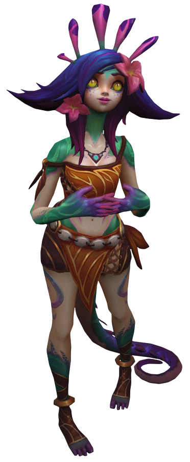 Sie suchte Trost und nahm die Form der geschmeidigen Dschungelkatzen an, denen sie zwischen den Bäumen begegnete, und versuchte, mit ihnen zu rennen. Neeko liebte es, schnell und wendig zu sein, und die hellen, scharfen Augen der Katzen erinnerten sie an Zuhause – bis sich ihre Anführerin vollkommen unerwartet in eine wunderschöne, starke Frau mit dunklen Haaren verwandelte. Nachdem sie sich eine Weile angespannt angestarrt hatten, stellte sie sich als Nidalee vor und nahm Neeko widerstrebend in die Gruppe auf.