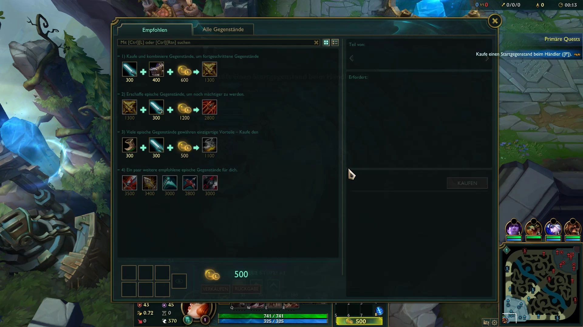850 Gold, jedoch besitzt weder der Spieler noch sonst irgendein Champion Gegenstände und man kann auch nicht den Shop betreten, um sich welche zu kaufen. Trotzdem erhält man Gold für das Töten der Gegner oder für das Töten gegnerischer Vasallen. - Der gegnerische hat keine
