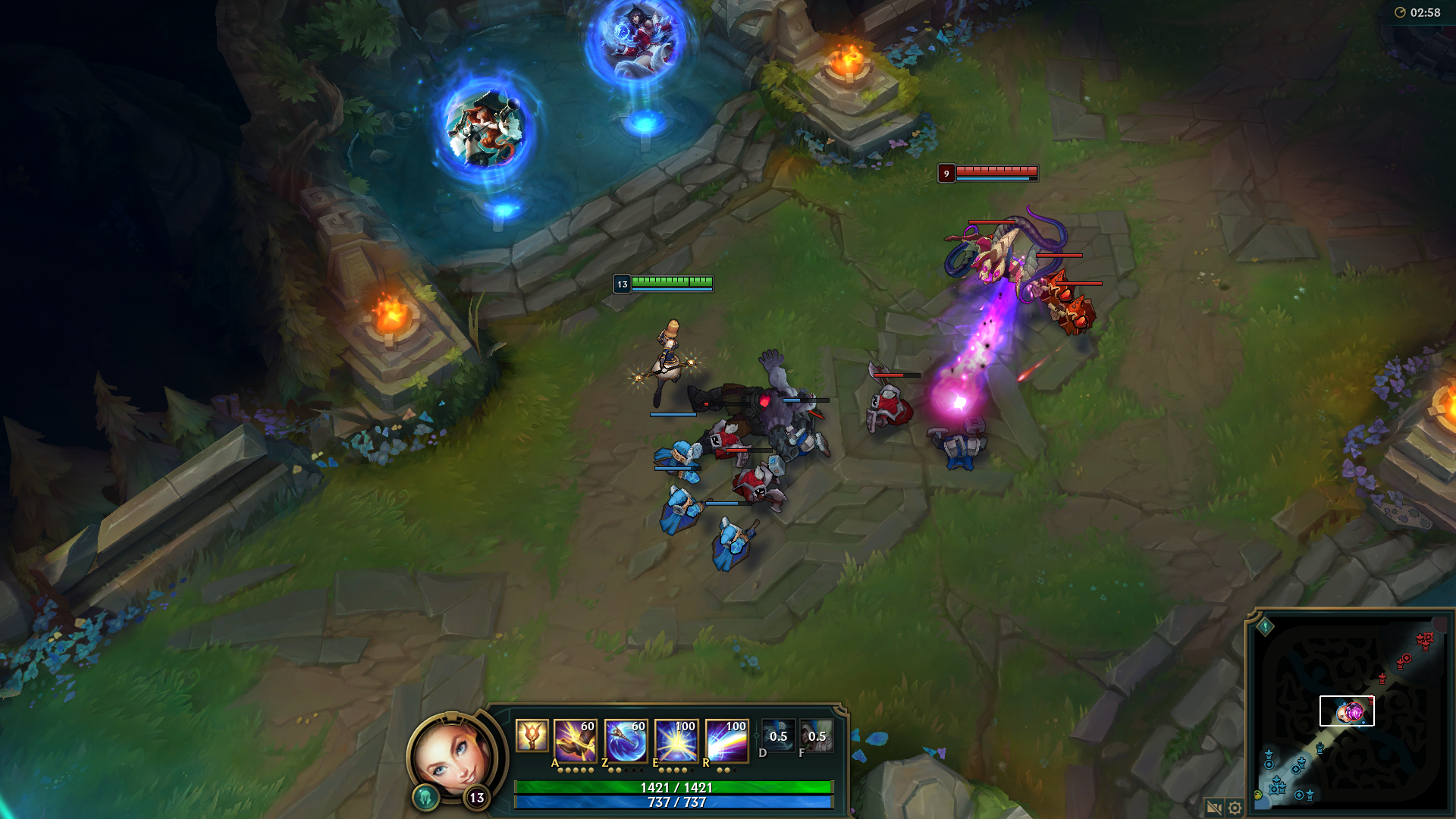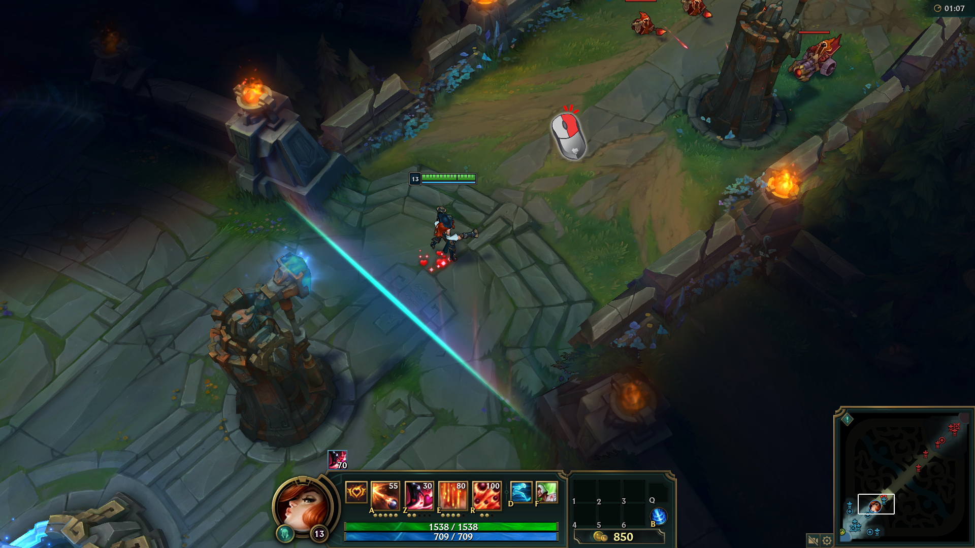 Al principio, comienzas cerca de una torreta aliada que está siendo atacada por 3 súbditos lanzadores y un súbdito de asedio.