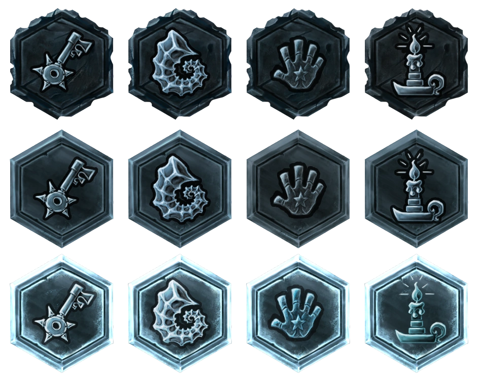 Obecnie jest 22 wariantów glifów i są one reprezentowane w czterech formach: świecy, ręki, muszli lub gwiezdnego klucza.
