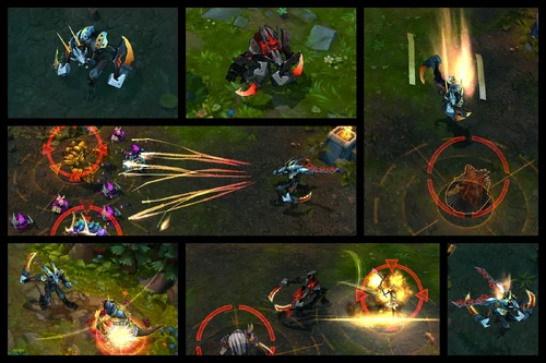„[1] nie jest jedynym, który przechodzi ewolucję w tym patchu - wystarczy, że spojrzycie na jego drugą skórkę! Z przyjemnością ogłaszamy, że druga skórka Łowcy Pustki jest najbardziej zaawansowaną skórką, jaką do tej pory wypuściliśmy w dniu wydania bohatera. Posiada ona nowy model, mechaniczne animacje, futurystyczne dźwięki i efekty zaklęć i głos z nutką sci-fi. Mecha Kha'Zix to uosobienie ewolucyjnej wspaniałości.”