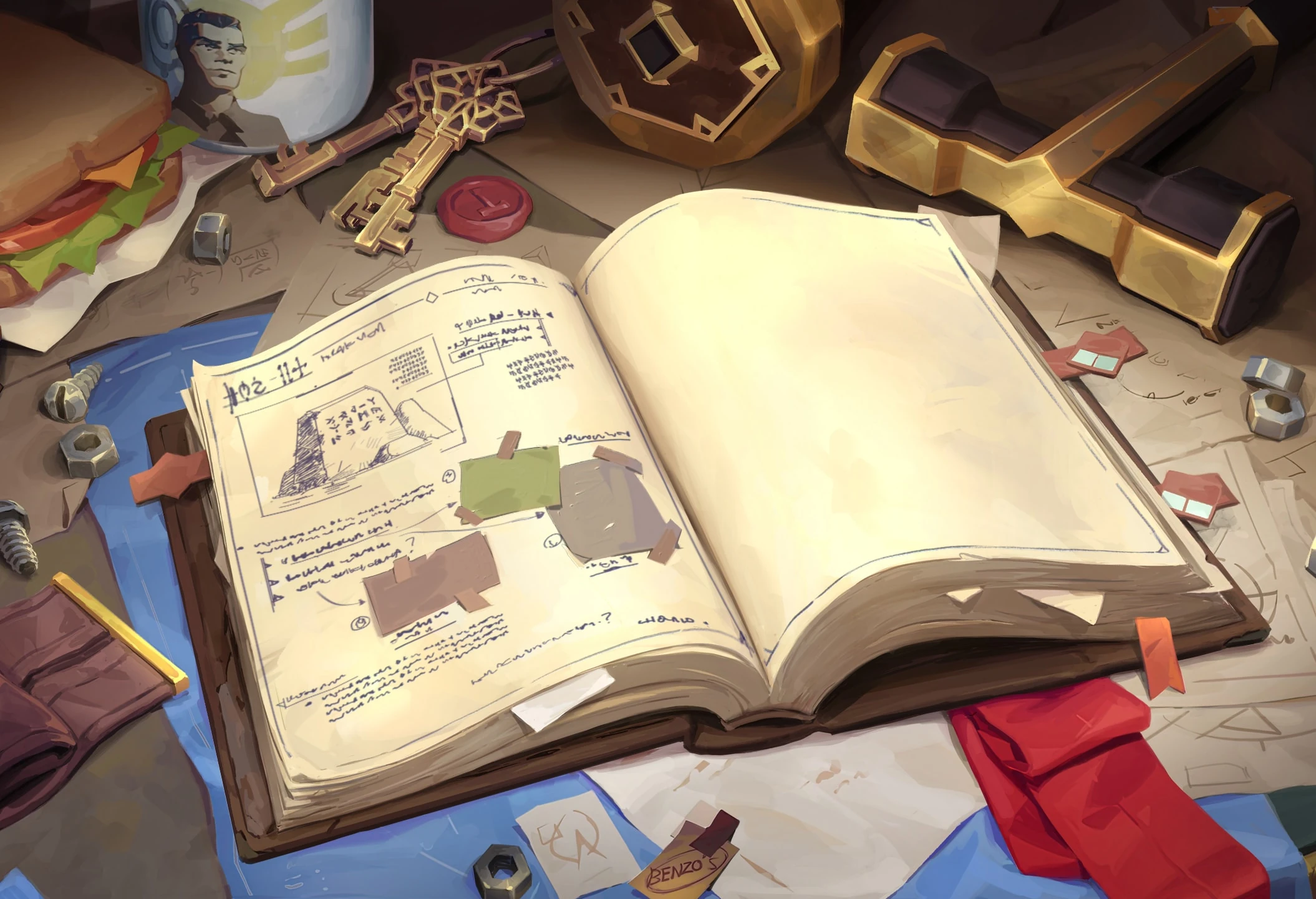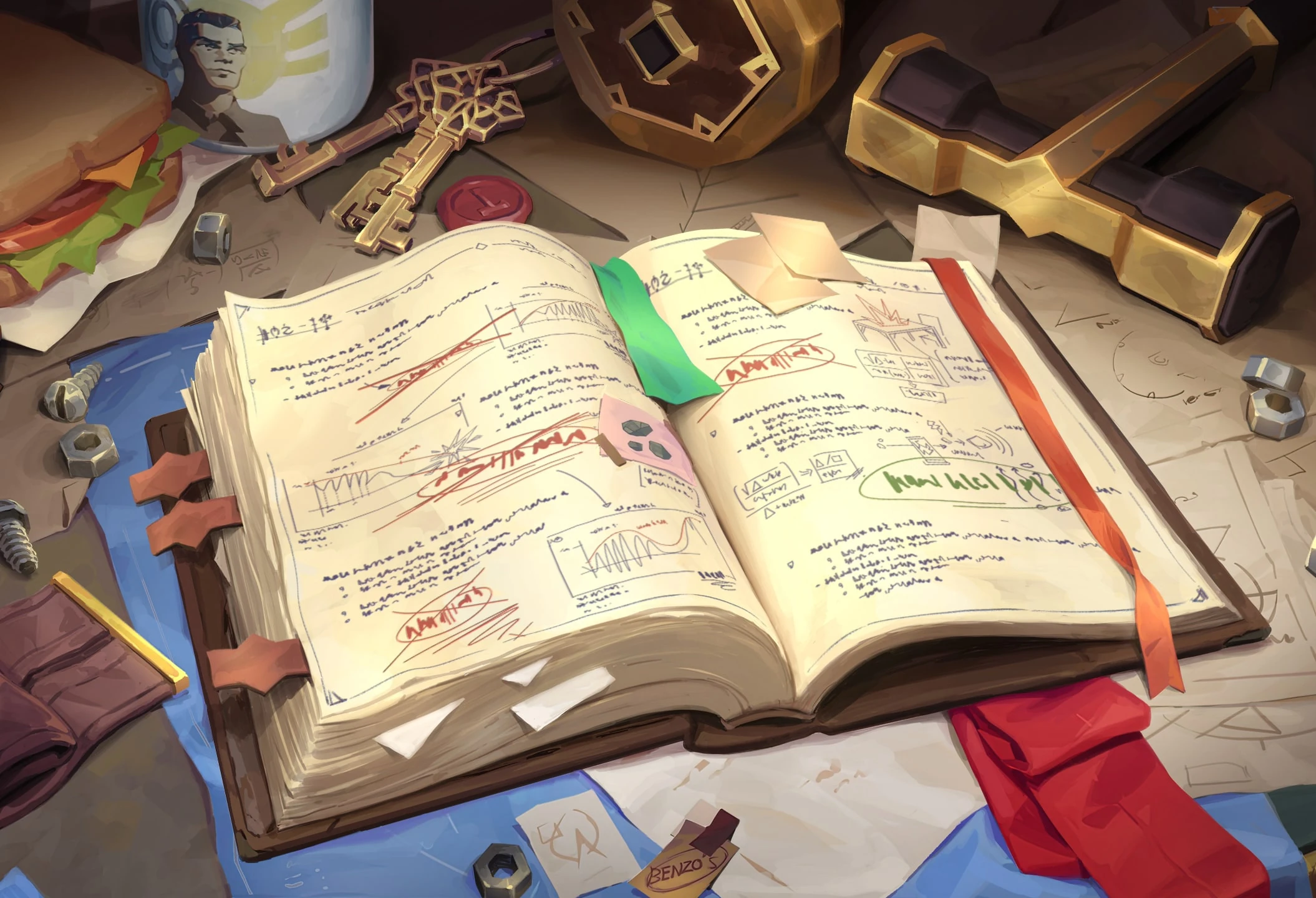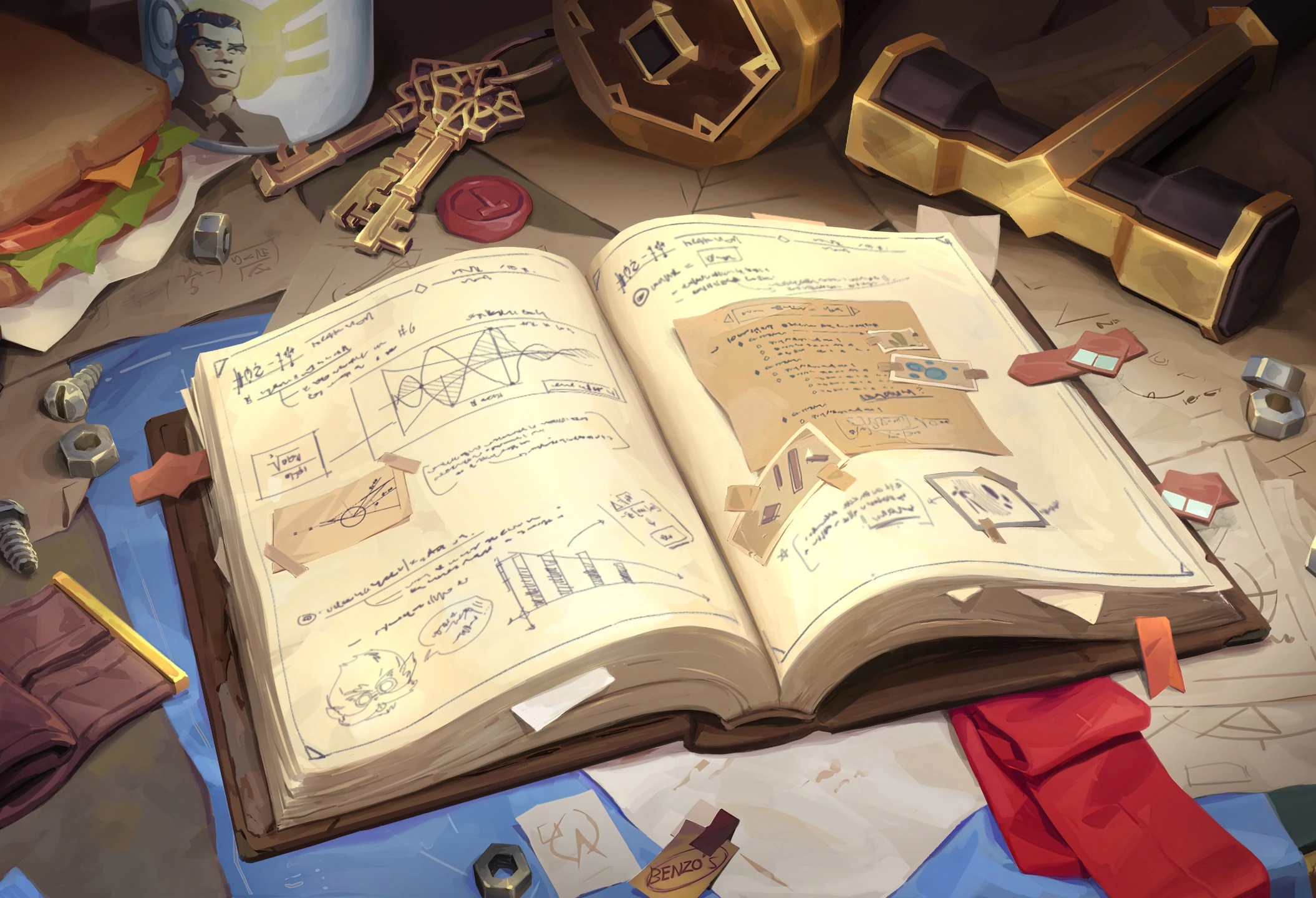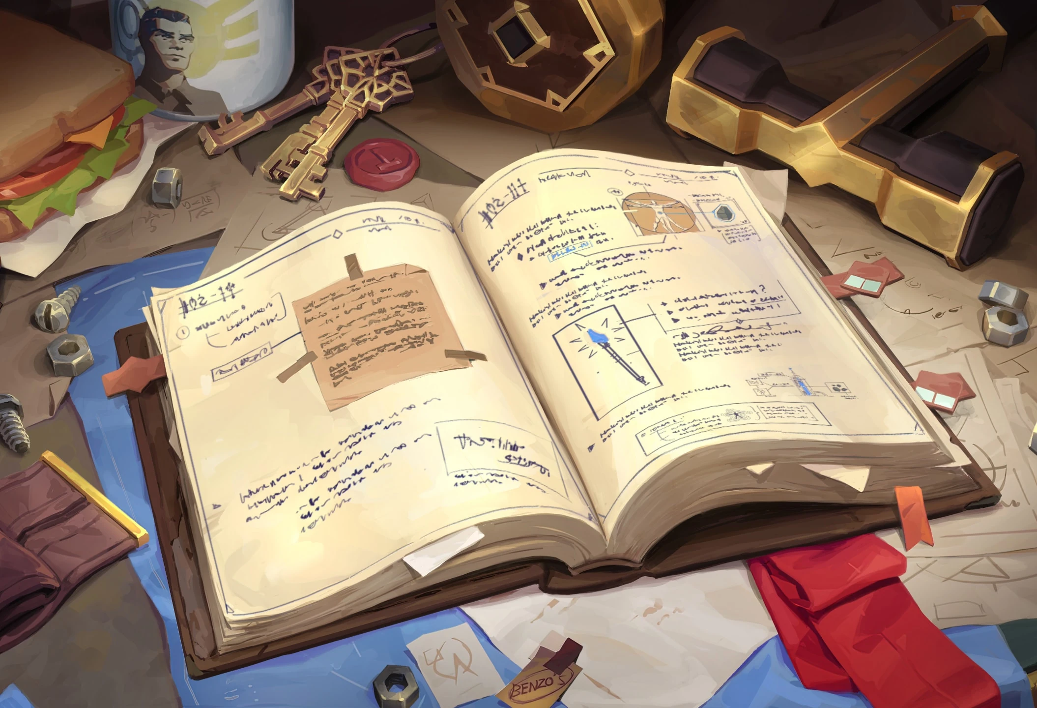 Рядом с набалдашником на рукояти этого искусно сделанного молота красуется вензель "Дж". Похоже, наш бесстрашный изобретатель подписывает не только заметки (на каждой странице!), но и свои инструменты. При необходимости молот может стать оружием, которое точно оставит на враге след!