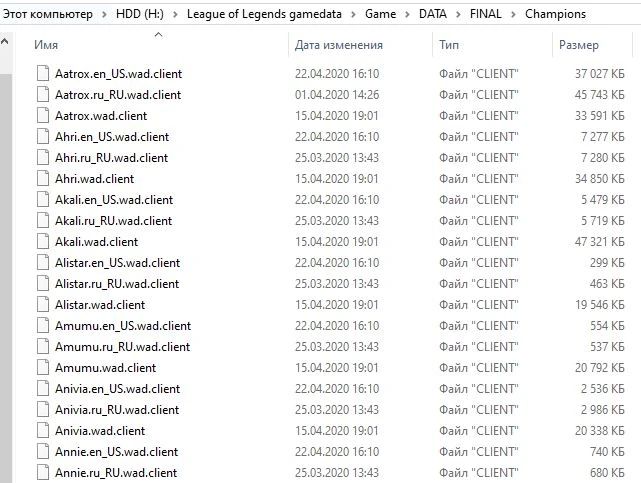 Чемпион.языковой код.wad.client, напримерAatrox.ru_RU.wad.client. Английский архив будет обозначен какAatrox.en_US.wad.client. Архив без языкового кода хранит звуковые эффекты умений и прочие сопутствующие аудиофайлы.