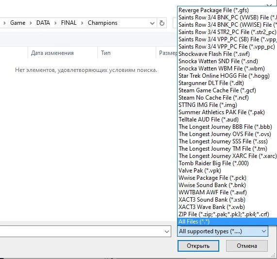 - В появившемся окне выберите желаемый файл озвучки чемпиона. Все файлы озвучки располагаются по в папке:
