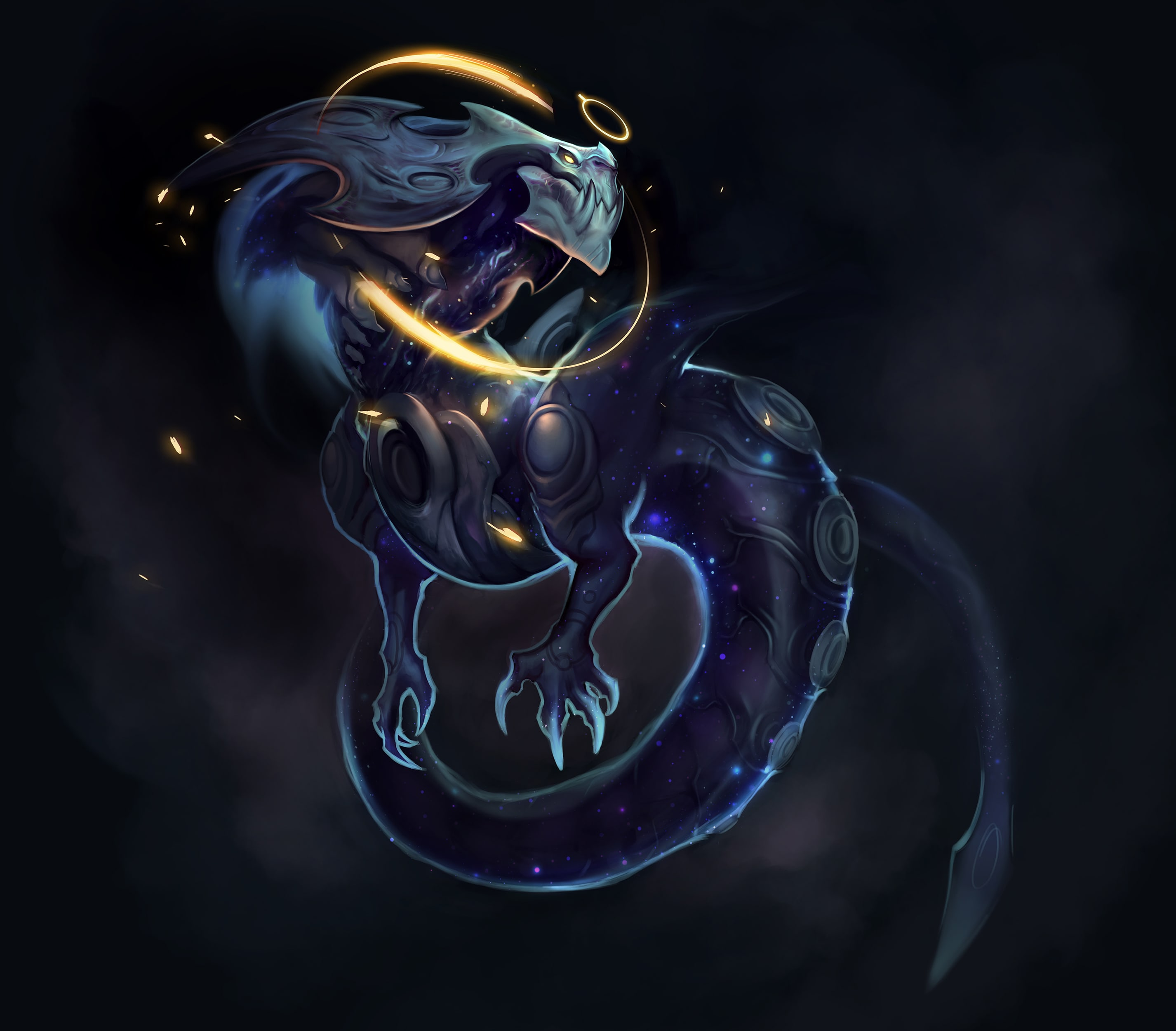 So, who exactly was this giant space dragon? We started out thinking about space itself, and why this dragon was there in the first place. After a few failed directions, we started thinking about him as a celestial creator, someone who literally created entire galaxies as he meandered about the final frontier. Instead of a Rek'Sai-style beast, he was an artist - a beautiful, magical being who'd for centuries created the constellations that peppered the night sky. The idea slotted in well with his burgeoning look, so we ran with it. But we needed that spark, that wink that'd catch us off guard, a square peg for the round holes we'd found in his character. So we gave him a sprinkle of pomposity along with his magnificence.