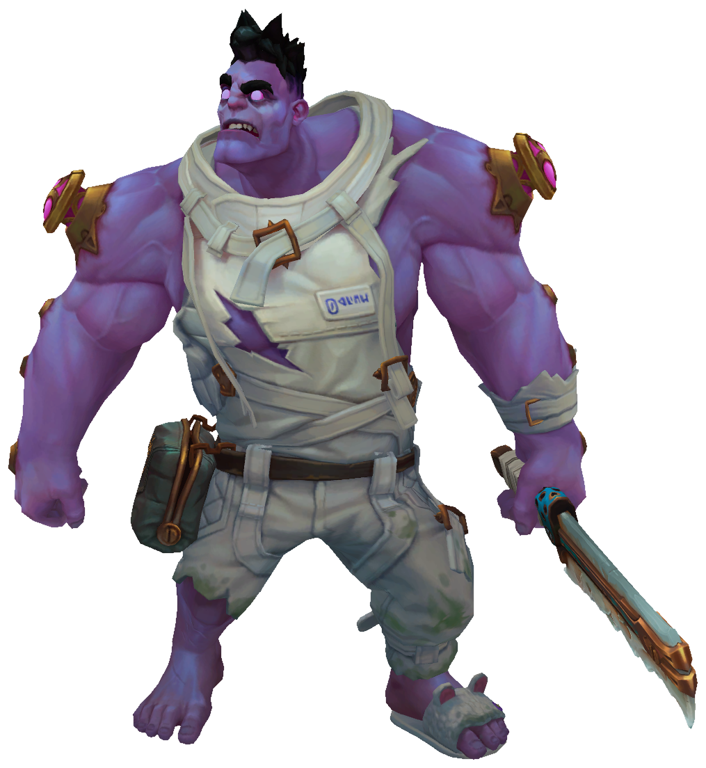Dr. Mundo is a towering man enhanced by Chemtech medicine and implants. His already large body gained even more muscles during his torture at the asylum, which also led to his purple skin and blue tongue. He currently wears a ragged restraining jacket, even though it is much too small for his figure.