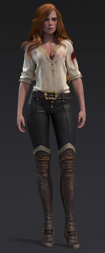 Normally she wears somewhat revealing clothes, consisting of a white blouse with seperate long sleeves, with a dark green vest that reveals her abdomen, black bell-bottom pants, black high-heeled boots and wears a black pirate hat on her head.