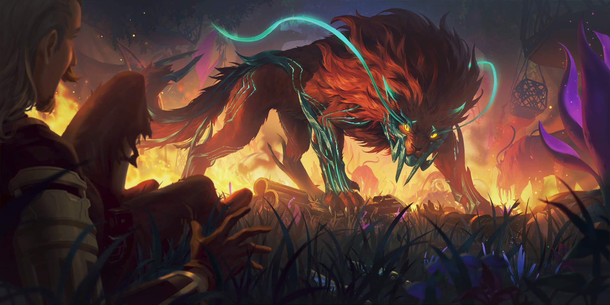 Wishing to protect her home and the wildlife, Nidalee gathered Neeko and the rest of the pack to plan an ambush on the the poachers' camp. When it turned night, Nidalee and her pack ambushed the camp, killing most of the poachers and freeing the captured wildlife to help them in the battle, such as the mighty towering