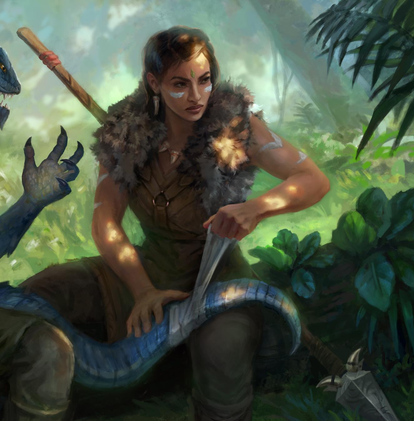 Raised in the deepest jungle, is a master tracker who can shapeshift into a ferocious pakaa at will. Neither wholly woman nor beast, she viciously defends her territory from any and all trespassers, with carefully placed traps and deft spear throws. She cripples her quarry before pouncing on them in feline form—the lucky few who survive tell tales of a wild woman with razor-sharp instincts, and even sharper claws...