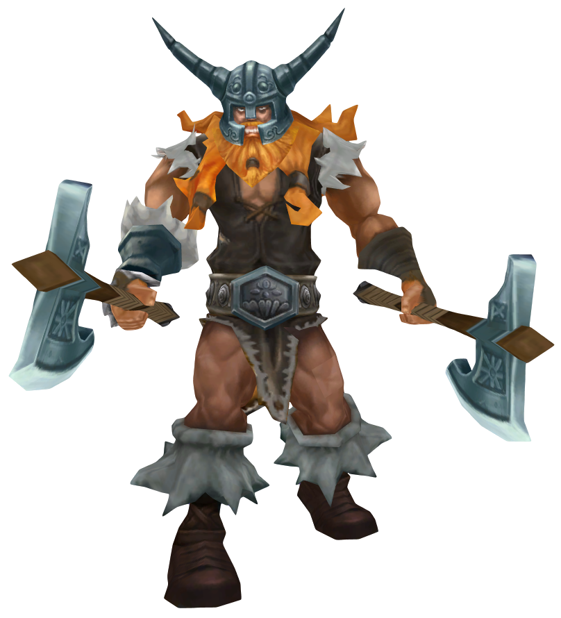 Olaf is an abnormally large fair-skinned man with toned muscles and a large ginger beard. He often wears a metal helmet with two large horns and various furs around his torso, wrists, and feet. He wields two axes tempered with True Ice that he uses constantly in battle.