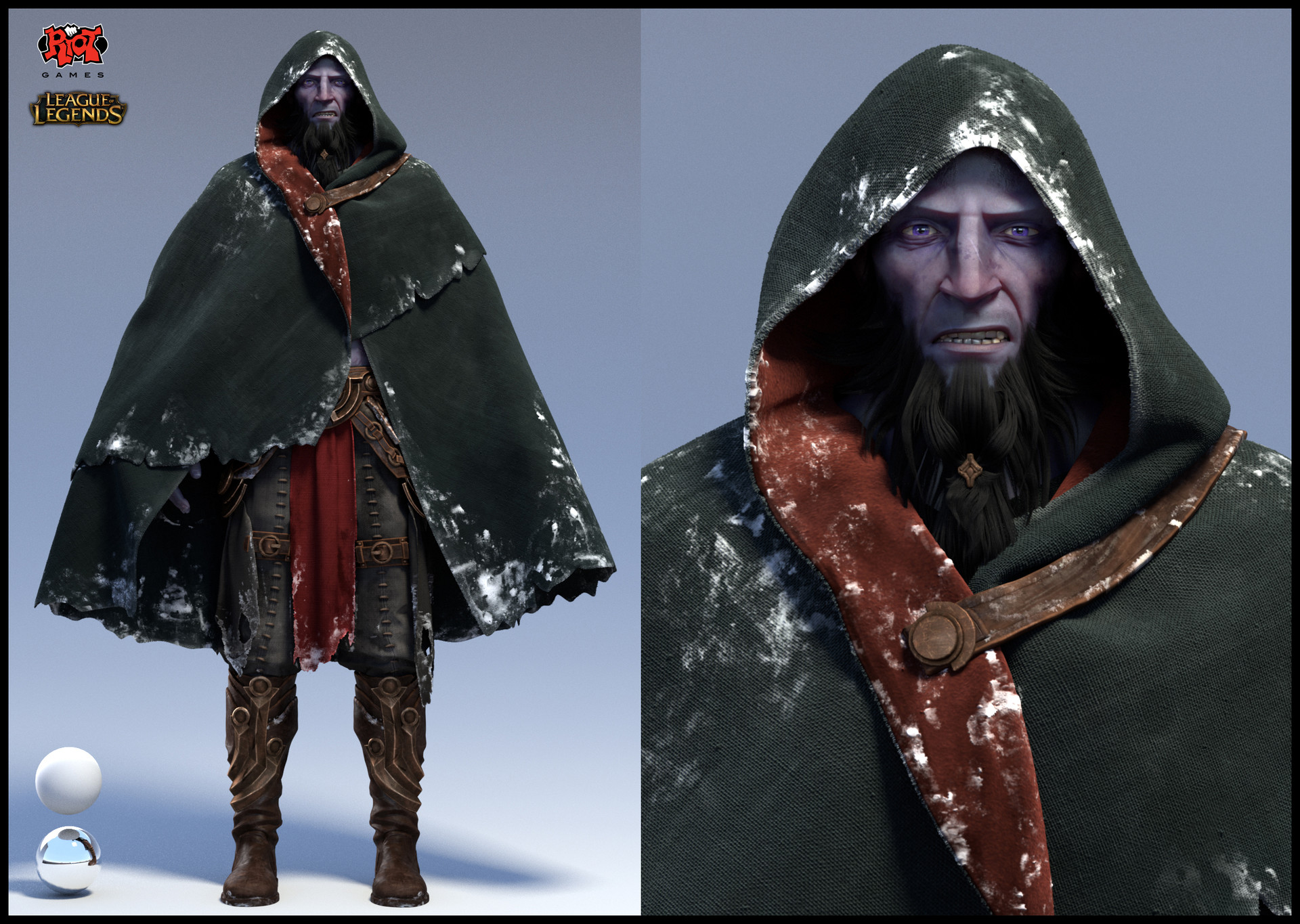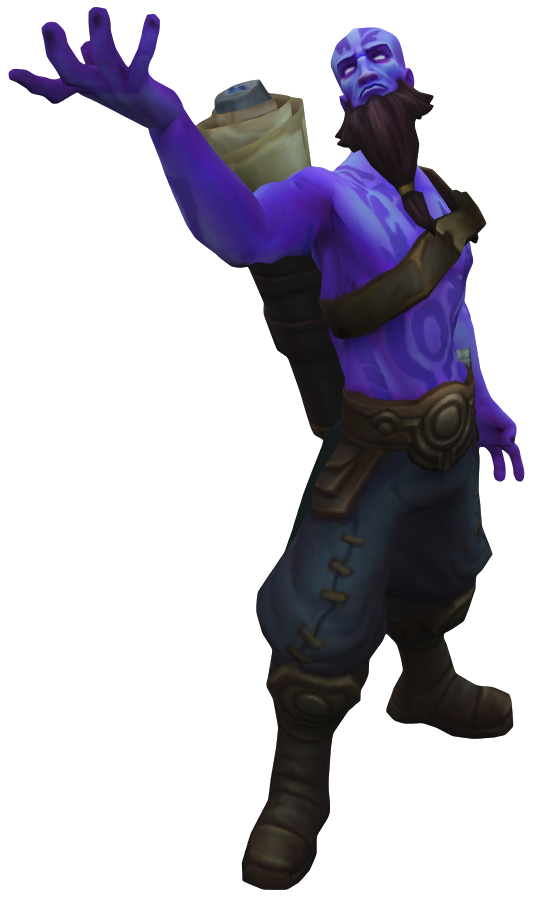 Ryze is a old man with violet skin due to prolonged contact with the World Runes. His body is full of tattoos in runic styles. He is bald but has a scrappy black beard, tied togheter at the end with a hair ring. Ryze is shirtless except for a a leather shoulderguard with a sash holding it togheter. A giant scroll is attached to his back, held there by the leather sash. He wears fairly detailess, loose, dark blue pants with high leather boots. Around his waist he wears a leather belt with a book tied to it.