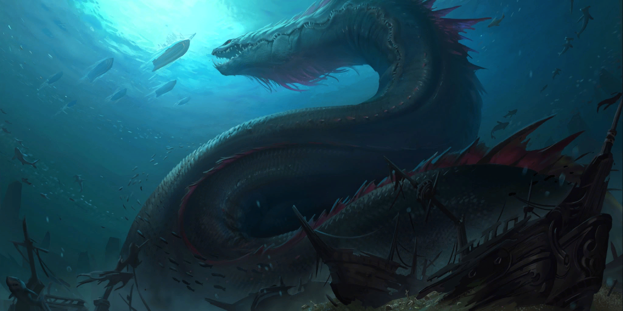 The serpents can also be seen attacking regular sea hunter ships, with numerous underwater shipwrecks indicating a sea serpent is near.