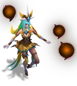 - Each of Syndra's abilities gain new graphical details when leveled to max rank. For details, see below in her Skin section.